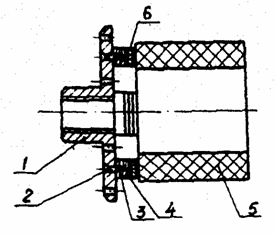 1-планшайба; 2- шуруп; 3-деревянная колодка переходника; 4- клей; 5- заготовка; 6- пенополистироловая колодка переходника.