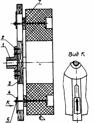 1-планшайба; 2- шуруп; 3- крестовина; 4-болт; 5- шайба с гайкой; 6-заготовка; 7-прокладка.